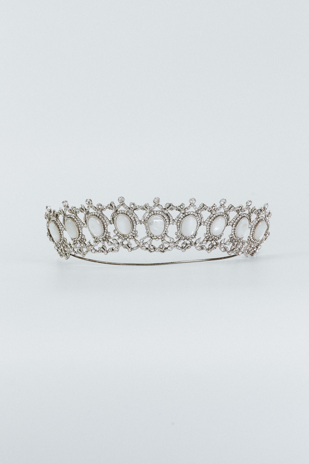 Los cristales Swarovski en tono nácar aportan una luminosidad suave y envolvente, de reflejos delicados y etéreos, mientras que las perlas refuerzan su carácter clásico y refinado, evocando la alta joyería destinada a reinas y emperatrices.