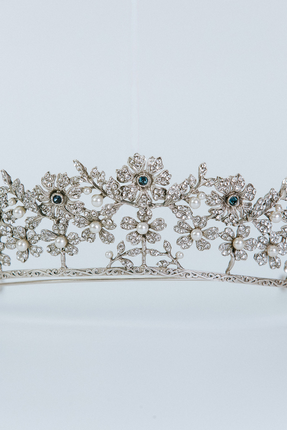 Sus líneas repujadas, precisas y equilibradas, crean un diseño atemporal que realza la belleza natural, mientras los cristales Swarovski —con óvalos en tono zafiro— aportan una luz poderosa y un aire de auténtica realeza.