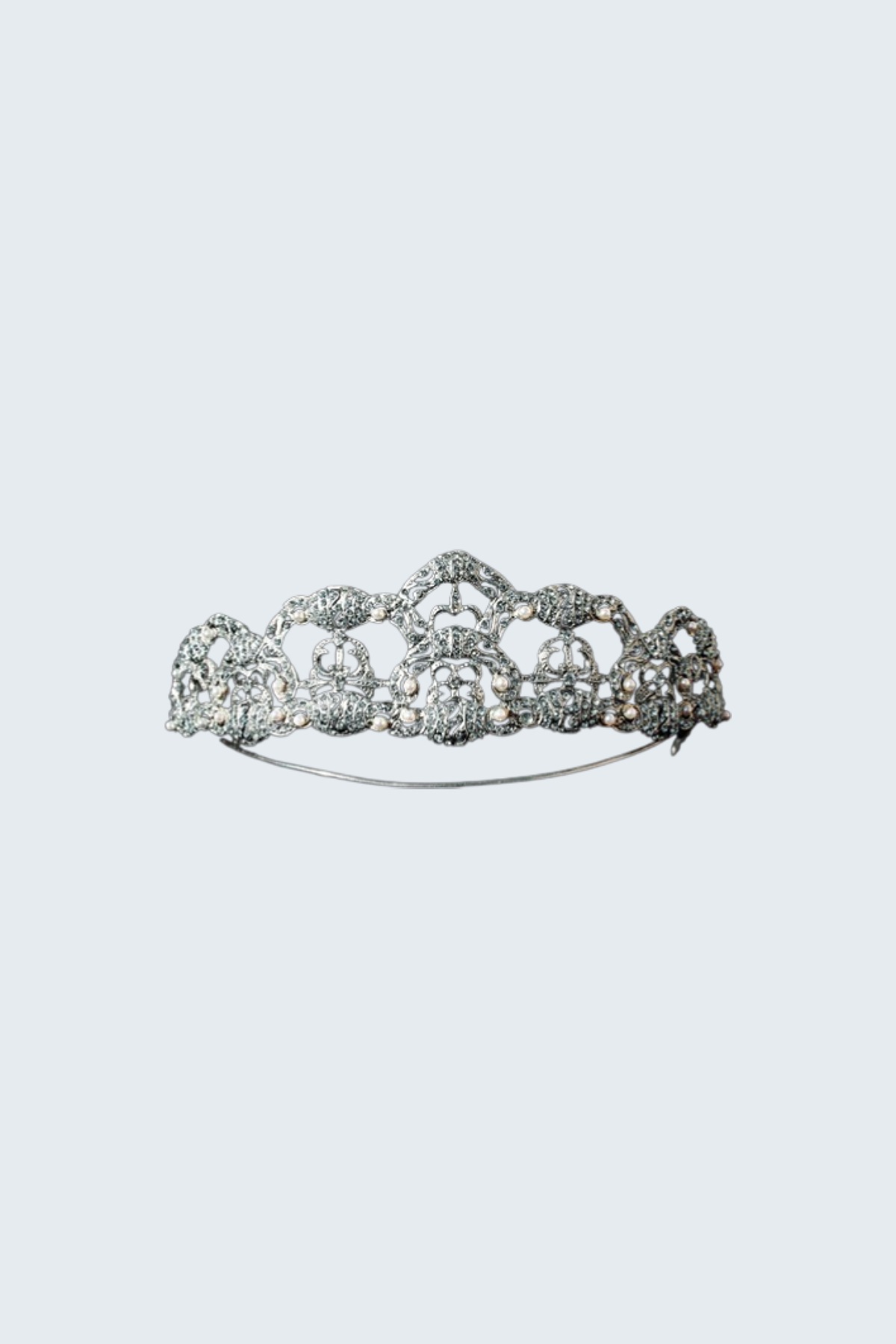 La luminosidad de la plata y los cristales Swarovski se funde con la pureza de las perlas, creando una joya solemne y sofisticada, digna de la realeza.