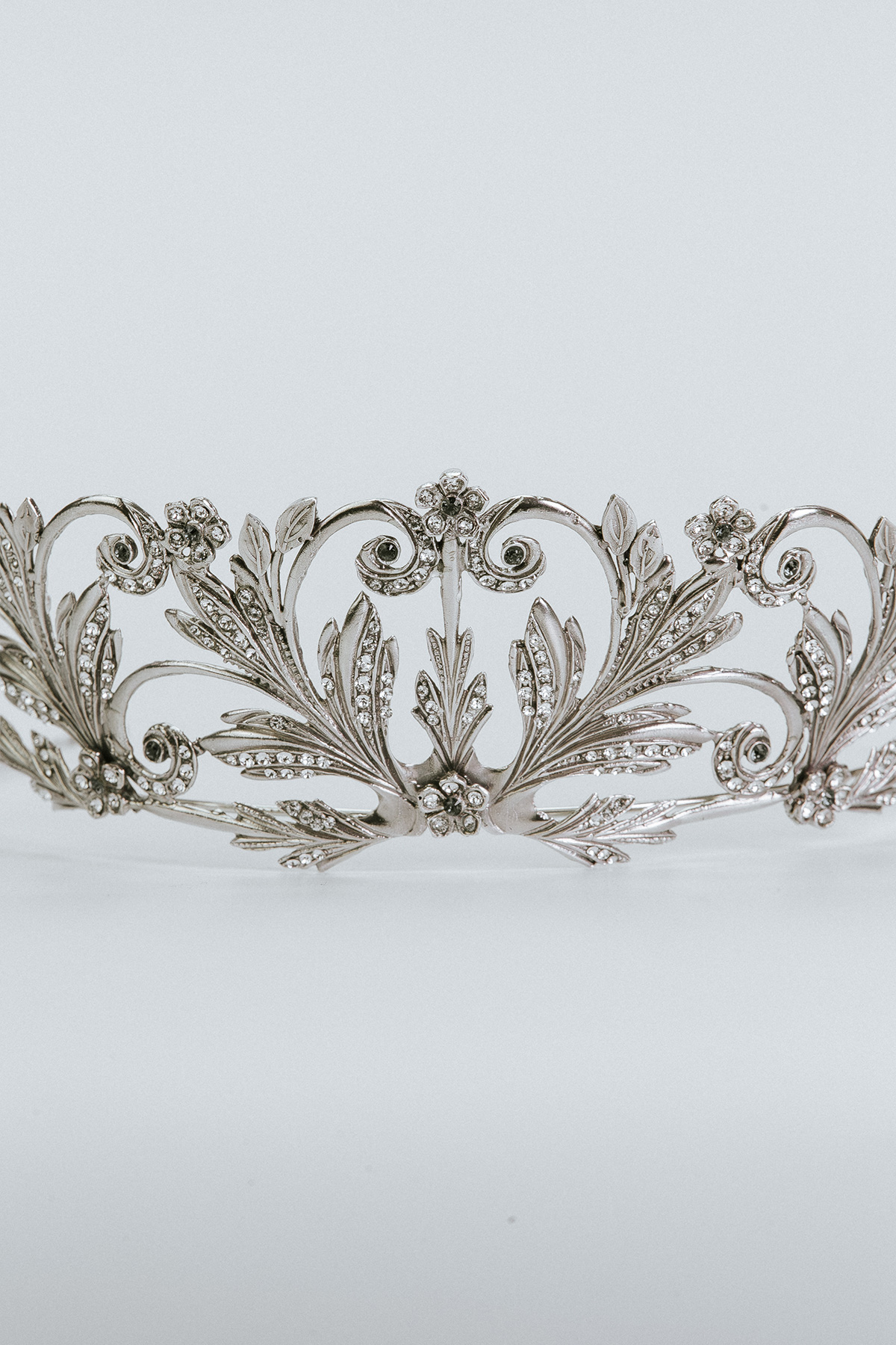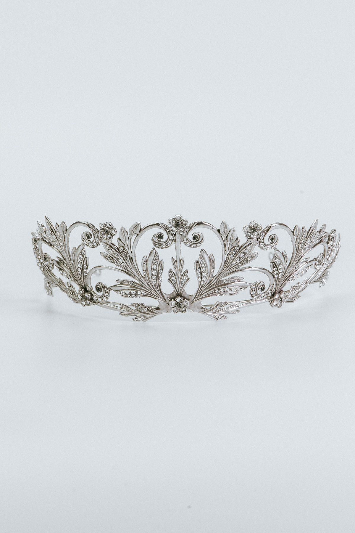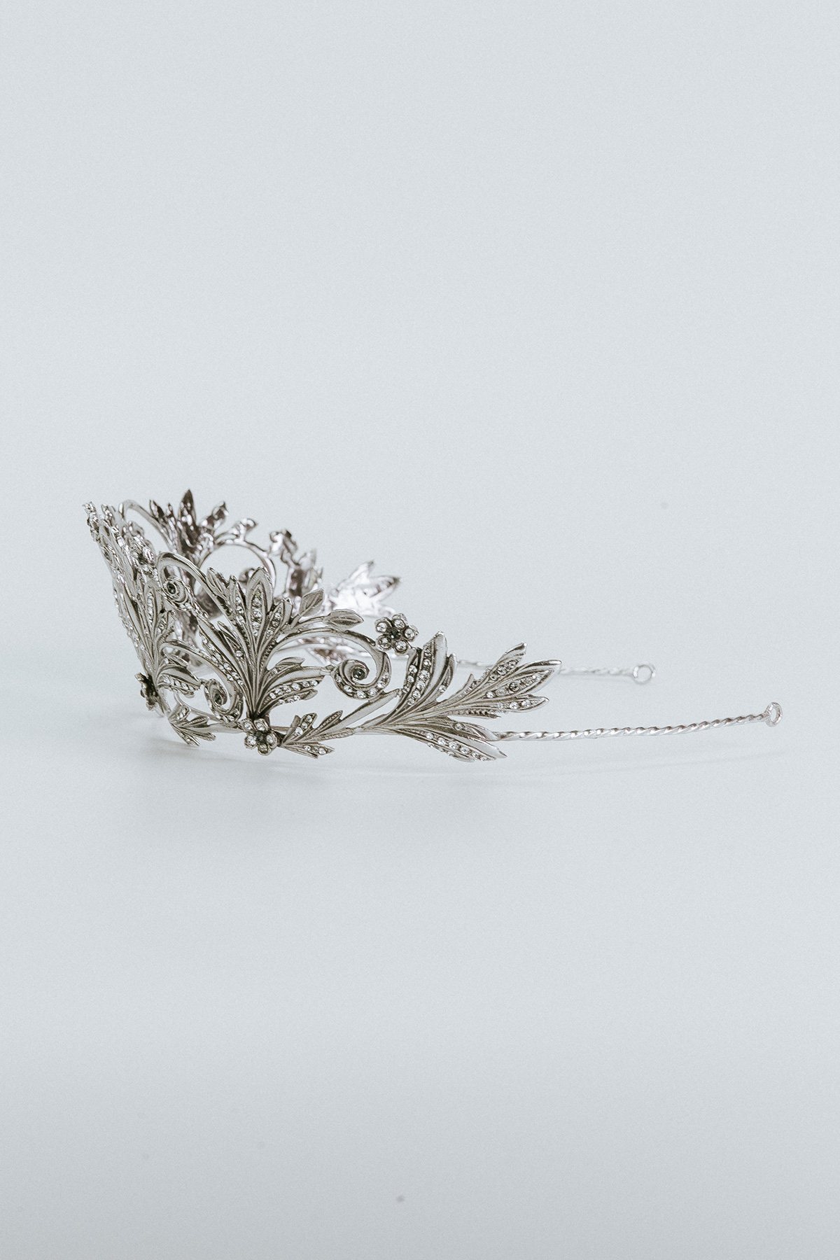 Su diseño floral, inspirado en jardines reales y en la alta joyería histórica, realza la feminidad con un brillo sutil y elegante. Realizada artesanalmente en plata de ley y cristal Swarovski, es una pieza con carácter, pensada para novias que buscan exclusividad, significado y una joya destinada a perdurar para siempre.