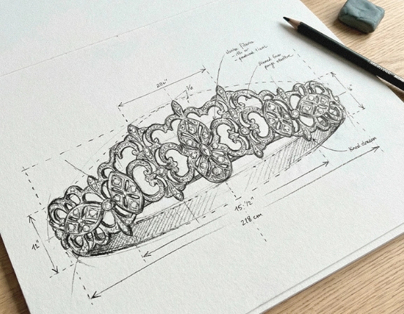 Piezas que nacen de una historia, no de un catálogo. Cuando decimos que cada tiara que creamos es única no es una manera de hablar: se piensa, se dibuja y se trabaja con calma, escuchando a quien la lucirá y lo que desea contar ese día. La visión del artesano lo hará posible.